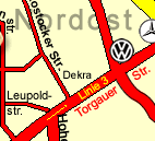 Ihr Weg von der A 14, Abfahrt Leipzig NO, zum Bistro: Mit dem PKW auf der B 87 Richtung Zentrum, nach der Dekra rechts abbiegen in die Rostocker Straße, an der nächsten Ampel links in die Stöhrerstraße abbiegen und über 2 Ampelkreuzungen hinweg (Achtung Vorfahrt beachten!) bis zum Bistro auf der rechten Seite fahren. |